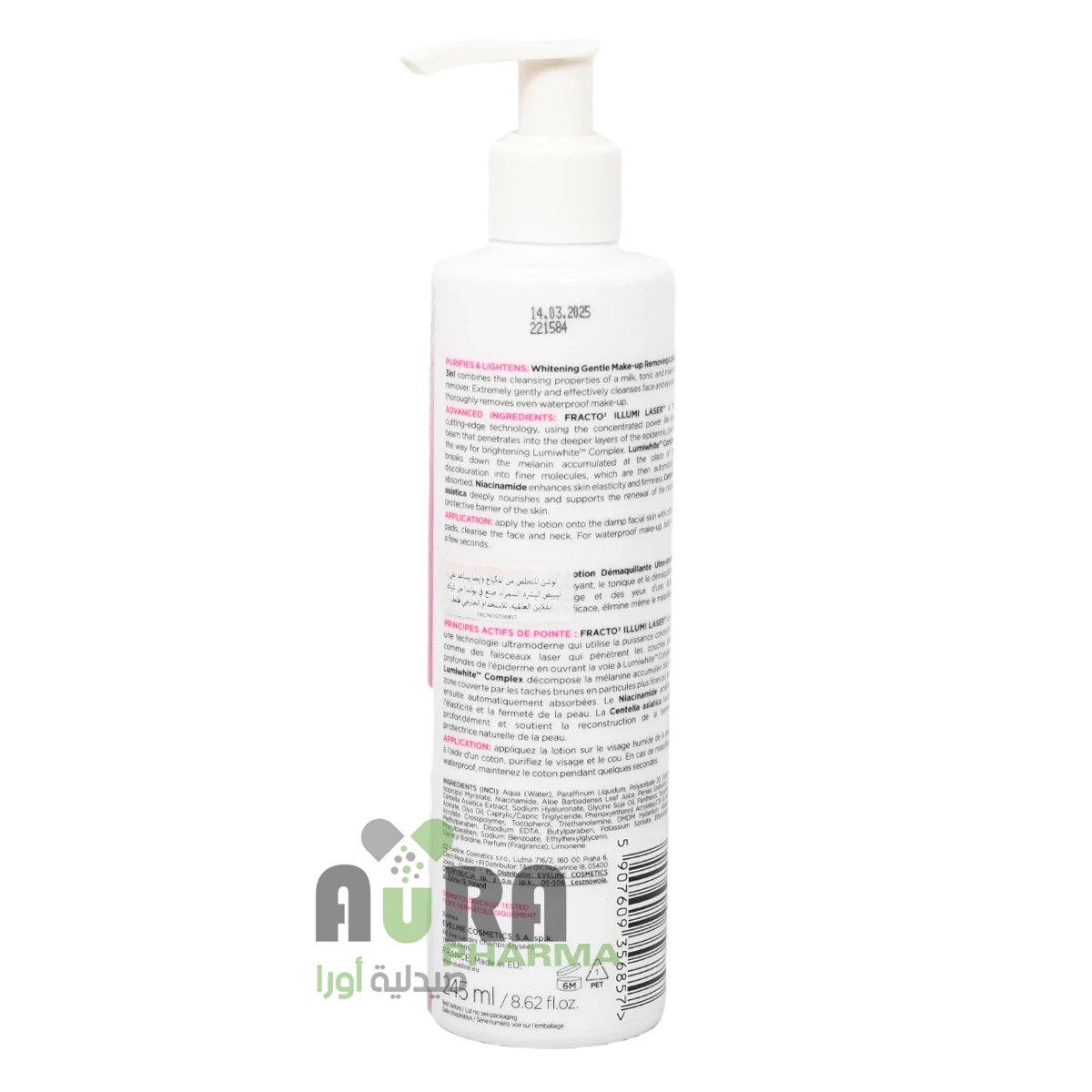 مركب أبيض يزيل حتى المكياج المقاوم للماء لجميع أنواع البشرة أيضًا. سلسلة مستحضرات التجميل WHITE PRESTIGE 4D الحساسة هي علاج مبتكر يعمل بأربعة أبعاد: تفتيح البشرة وتوحيد لون البشرة ومقاومة التصبغ الزائد لمدة تصل إلى 48 ساعة بعد الاستخدام. ينقي ويفتح: لوشن التبييض اللطيف لإزالة المكياج 3 في 1 يجمع بين مزايا الحليب المنظف والمنشط ومزيل المكياج، وينقي بشرة الوجه ومنطقة العينين بلطف وفعالية، ويزيل تمامًا حتى المكياج المقاوم للماء. ينظم اللوشن الغني بمركب Lumiskin™ 4D White Complex إنتاج الميلانين ويساعد على التخلص من الخلايا الميتة الزائدة من سطح الجلد، مما يجعله أخف وزنًا وأكثر تألقًا. المكونات المتقدمة: Lumiskin™ - يقيد عمليات إنتاج الميلانين المسؤولة عن تغير اللون، ويفتح ويمنع تكوين بقع جديدة. حمض الهيالورونيك - يضمن مستوى مثاليًا من ترطيب البشرة، ويعزز مرونة البشرة وشدها. مستخلص الليمون - يفتح لون البشرة بلطف، ويشد ويقلل المسام. ينعش وينشط البشرة. مستخلص الحرير - ينعم البشرة إلى أقصى حد، ويجعلها ناعمة ومرنة للغاية. فيتامين E - يغذي البشرة ويجددها ويحميها وينعمها. النتائج: بشرة خالية من المكياج والشوائب، ومجهزة بشكل مثالي لعلاج التبييض وايت برستيج 4D. التطبيق: ضعي المستحضر على بشرة الوجه الرطبة باستخدام وسادة قطنية مبللة، ثم نظفي الوجه والرقبة. لإزالة مكياج العيون، ضعي قطعة القطن المبللة لفترة على الجفن المغلق، كرري ذلك حتى تصبح قطعة القطن نظيفة.