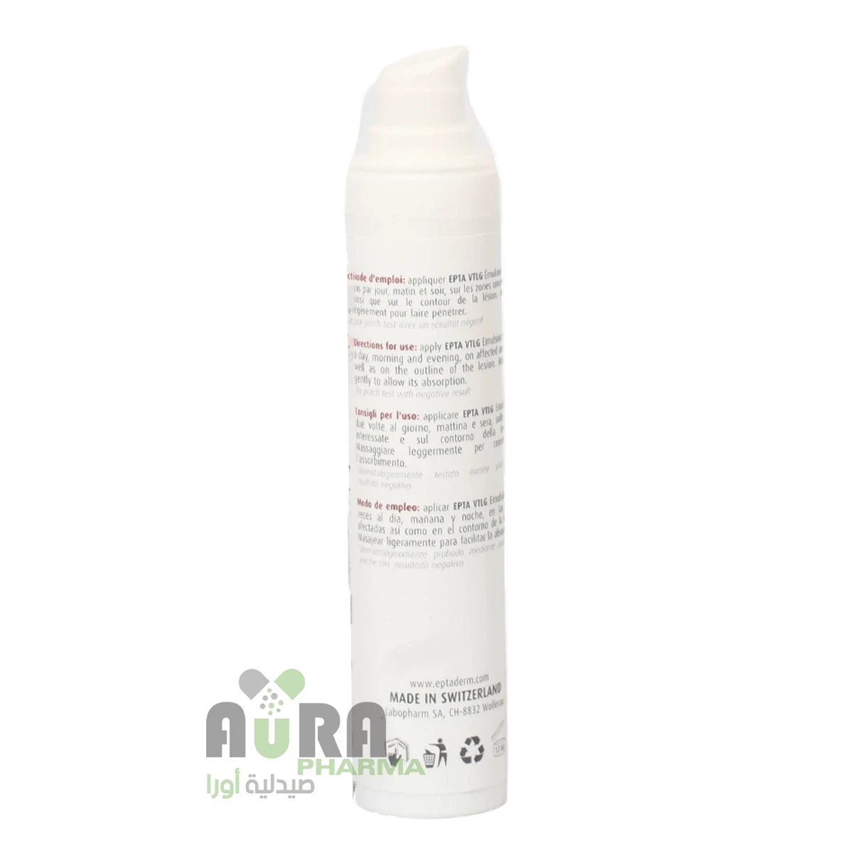 قم بتطبيق EPTA VTLG Emulsion Emulsion مرتين يوميًا، صباحًا ومساءً، على المناطق المصابة وكذلك على الخطوط العريضة للآفة. قم بالتدليك بلطف للسماح بامتصاصه. *عن طريق اختبار التصحيح بنتيجة سلبية