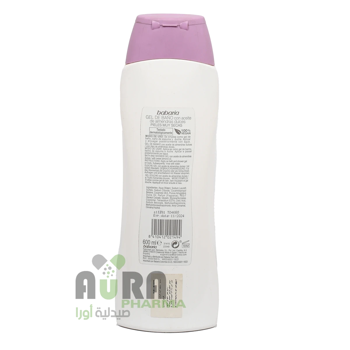 جل الاستحمام بزيت اللوز الحلو 600 مل من باباريا هو منتج للعناية بالجسم يُستخدم أثناء الاستحمام. يحتوي على زيت اللوز الحلو الذي يُعتبر من المكونات المرطبة والمغذية للبشرة. إليك بعض المعلومات الأساسية عنه: