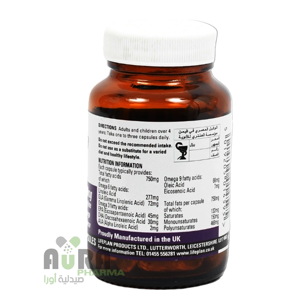 مركبات الأوميغا 6 في كل كبسولة: أحماض دهنية لانولييك 216 ملغم. أحماض دهنية جامالاينولينك 86 ملغم. مركبات الاوميغا 9 في كل كبسولة: أحماض دهنية اولييك 165 ملغم.